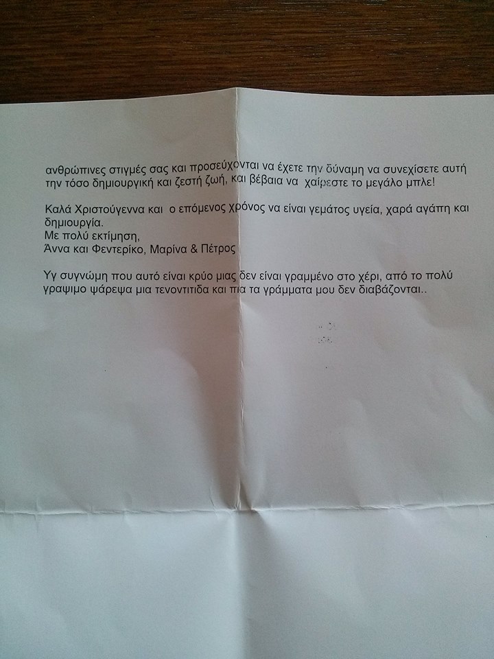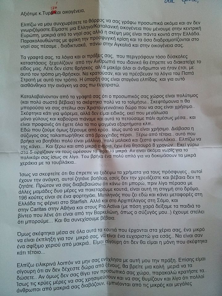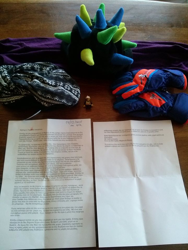 Φέτος για την οικογένειά μας ήταν μια πάρα πολύ δύσκολη χρονιά. Είχε από όλα τα δεινά. Μια μεγάλη πρόκληση για όλους μας ήταν το προσφυγικό. Μέσα από την "Αγκαλιά" ήρθαμε αντιμέτωποι με τα όριά μας και με τόσο ανθρώπινο πόνο που δεν χωράει ο νους. Όμως δίπλα μας υπήρχαν άνθρωποι που μας στήριξαν. Δίχως αυτούς δεν θα γινόταν τίποτα. Πριν δυο μέρες λάβαμε ένα πακέτο. Ειλικρινά έχουμε λάβει πολλά γράμματα και μηνύματα υποστήριξης, αλλά ετούτο, για κάποιον λόγο μας αλάφρυνε τη ψυχή. Προσωπικά διαβάζοντάς το βούρκωσα. Είχε μέσα δωράκια, τα πιο πολύτιμα αγιοβασιλιάτικα δώρα. Κάποιοι άνθρωποι ξεχειλίζουν από αγάπη και στη μεταφέρουν με έναν τρόπο τόσο διακριτικό και δυνατό που σε κάνουν να πιστεύεις πως τελικά ίσως το παιχνίδι να μην είναι χαμένο. Άννα, Φρεντερίκο, Μαρίνα και Πέτρο, ίσως ποτέ να μην βρεθούμε αλλά ευχαριστούμε από καρδιάς που μας φτιάξατε τα Χριστούγεννα. Πραγματικά ευχαριστούμε. Δεν ξέρω αν θα διαβάσετε αυτήν την ανάρτηση, το ισοθερμικό θα το φορώ στο ψάρεμα, ο Παντελής παίζει με μανία τα lego και είναι σαν σκαντζόχοιρος με το σκουφί (λέει οτι είναι δράκος) ενώ η Κατερίνα λέει πως όχι μόνο είναι ζεστό το μερινός αλλά και είναι στο αγαπημένο της χρώμα.
